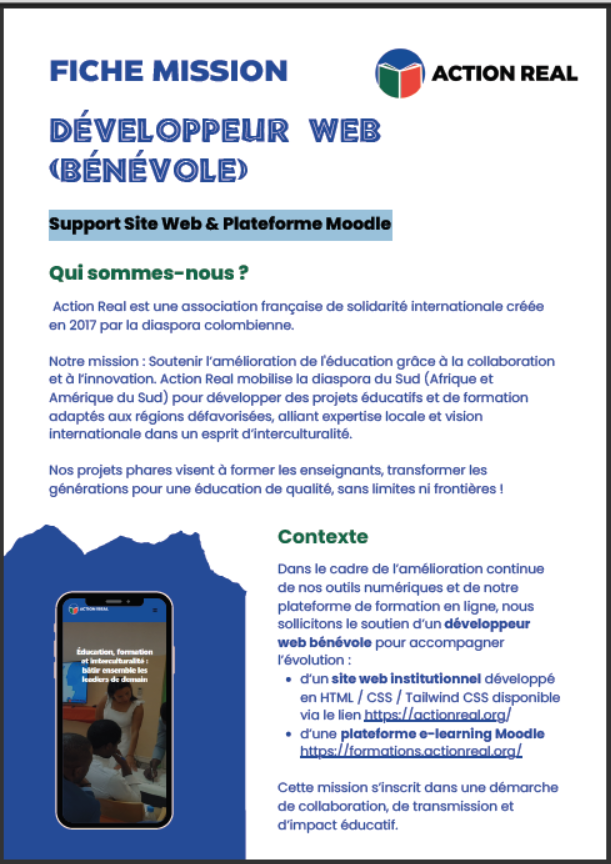 Deux possibilités s’offrent à vous : nous publions régulièrement des recherches de profils spécifiques sur nos réseaux sociaux, alors suivez-nous et ouvrez l'œil ! Nous acceptons également les candidatures spontanées. N’hésitez pas à nous adresser un mail à association@actionreal.org pour nous communiquer votre envie de participer et nous préciser comment vous pourriez contribuer à notre association. Toute expertise est la bienvenue, même si vous avez simplement envie d'apporter votre grain de sel pour améliorer l'éducation dans les pays où nous sommes présents !